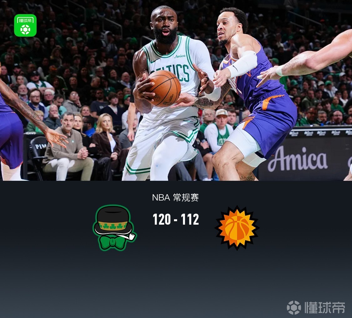 北京时间3月17日NBA 常规赛,波士顿凯尔特人对阵菲尼克斯太阳。上半场双方展开对攻,半场凯尔特人65-61太阳,末节初凯尔特人一度领先10分,随后太阳反扑反超4分,但比赛最后阶段太阳突然哑火,凯尔特人塔图姆、布朗领衔持续冲框反超拉开分差,最终凯尔特人120-112太阳。