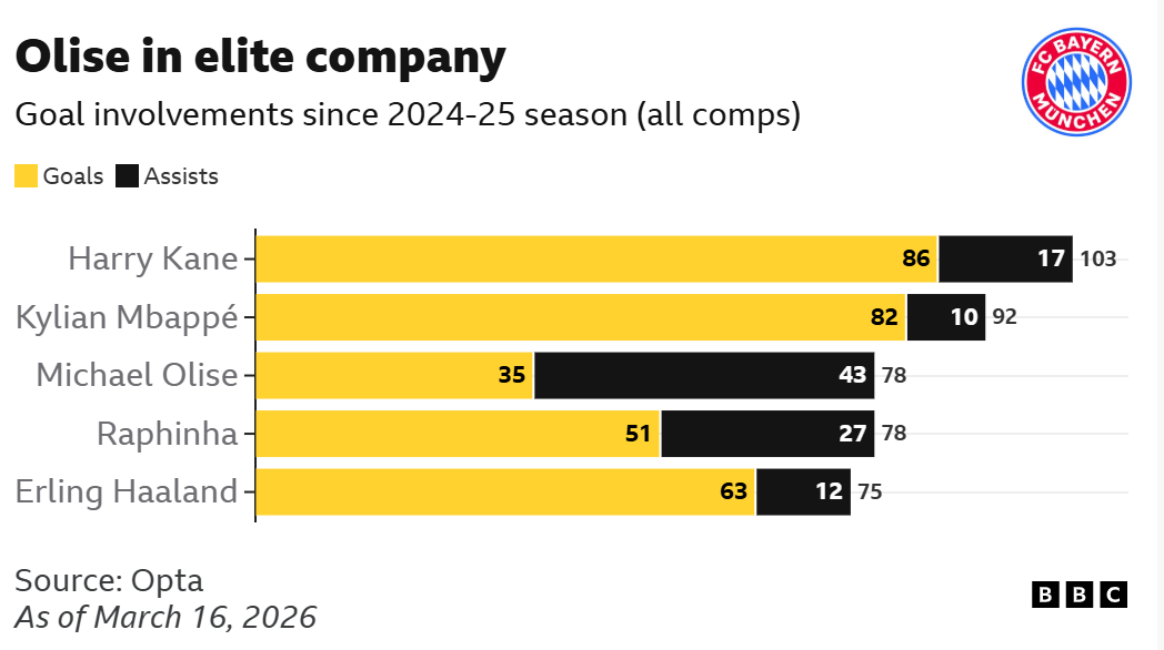 奥利塞在德国的首个赛季就在各项赛事贡献了17粒进球和21次助攻,本赛季至今,他已斩获15粒进球和23次助攻,是欧洲足坛最具效率的进攻球员之一。自从他转会拜仁慕尼黑以来,只有欧洲大陆的顶级攻击手才能与奥利塞的整体进球效率相媲美。