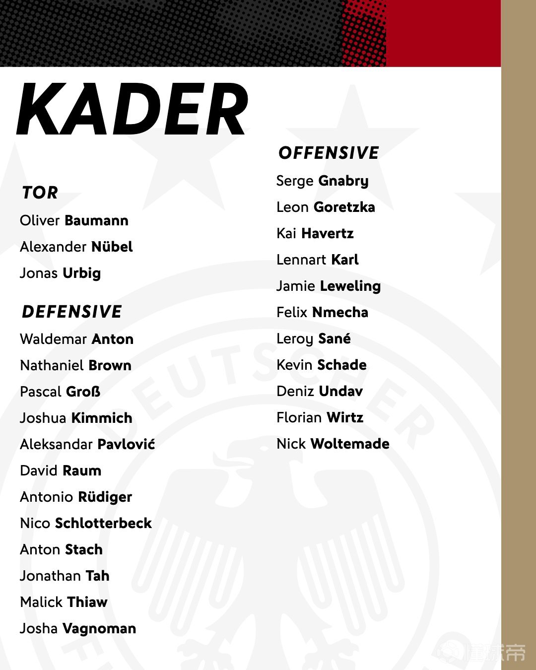 首页 > 足球新闻 > 德国队大名单:维尔茨、沃尔特马德在列,乌尔比希、卡尔入选
