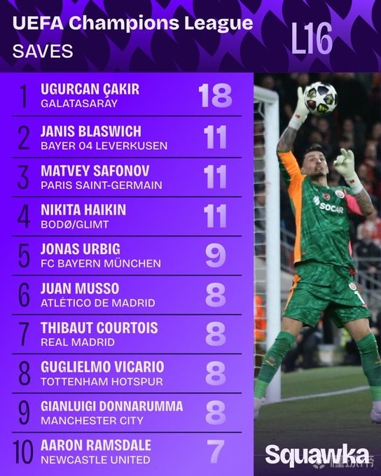 在今天凌晨进行的欧冠八分之一决赛次回合比赛中,加拉塔萨雷客场0-4不敌利物浦,总比分1-4不敌对手遭淘汰,其中门将恰基尔奉献了11次扑救。