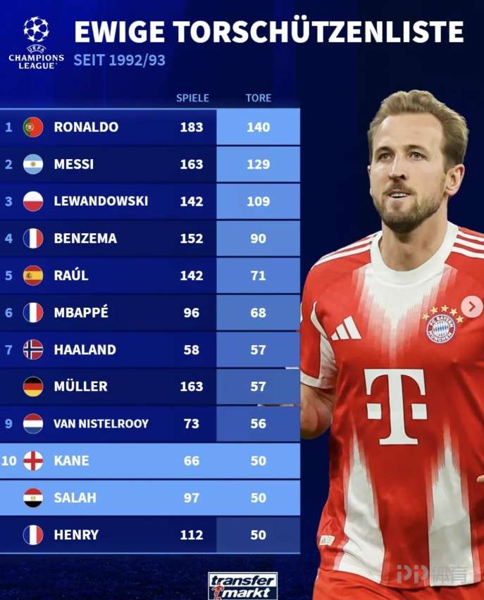 德转统计了自1992/93赛季以来欧冠总射手榜。C罗和梅西分别打进140球和129球排名前二。在欧冠1/8决赛次回合取得进球的哈兰德使自己的欧冠总进球达到57粒,追平托马斯-穆勒排名榜单并列第七。同样取得进球的凯恩和萨拉赫分别达成欧冠50球的里程碑,并列榜单第十。