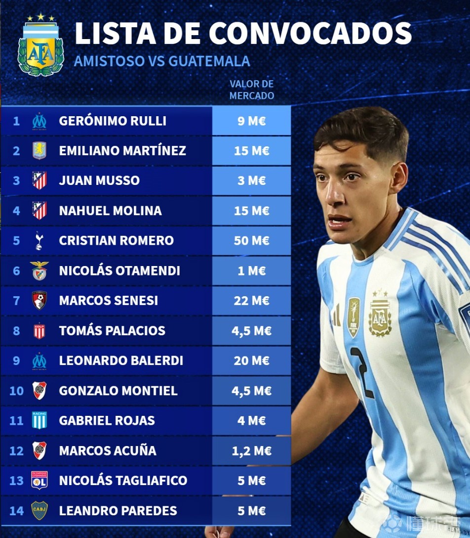 北京时间3月19日,在阿根廷国家队公布新一期大名单之后,德转也列出了阿根廷队此次28人大名单的身价排行榜,胡利安-阿尔瓦雷斯和恩佐-费尔南德斯同以9000万欧元并列第一,麦卡利斯特8000万欧元第三,梅西1500万欧元。